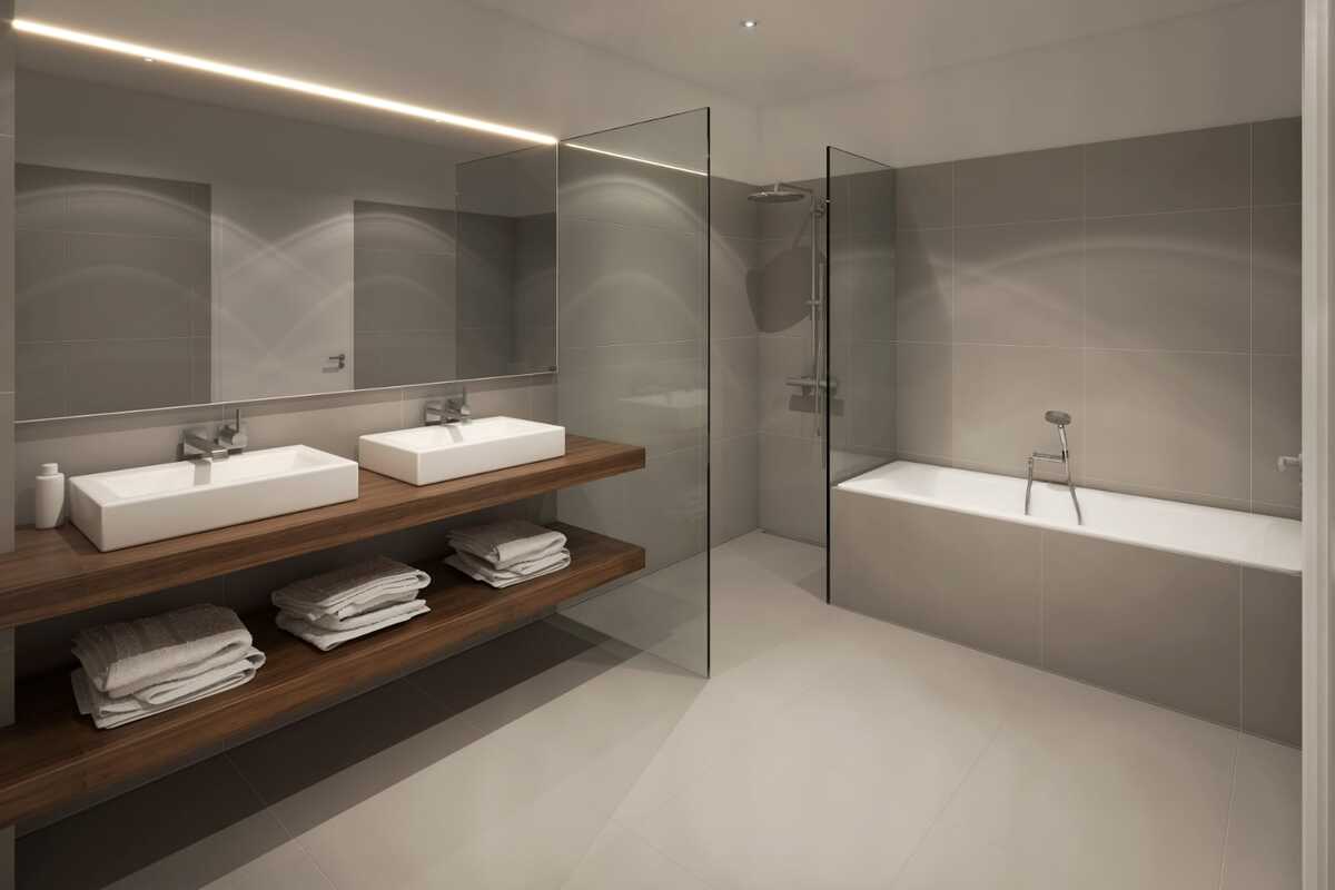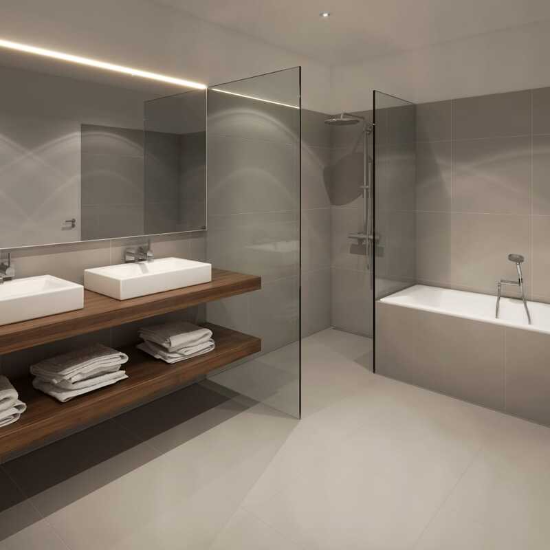 - Modernes Badezimmer: Hochwertige Sanitärelemente, großformatige Fliesen,
