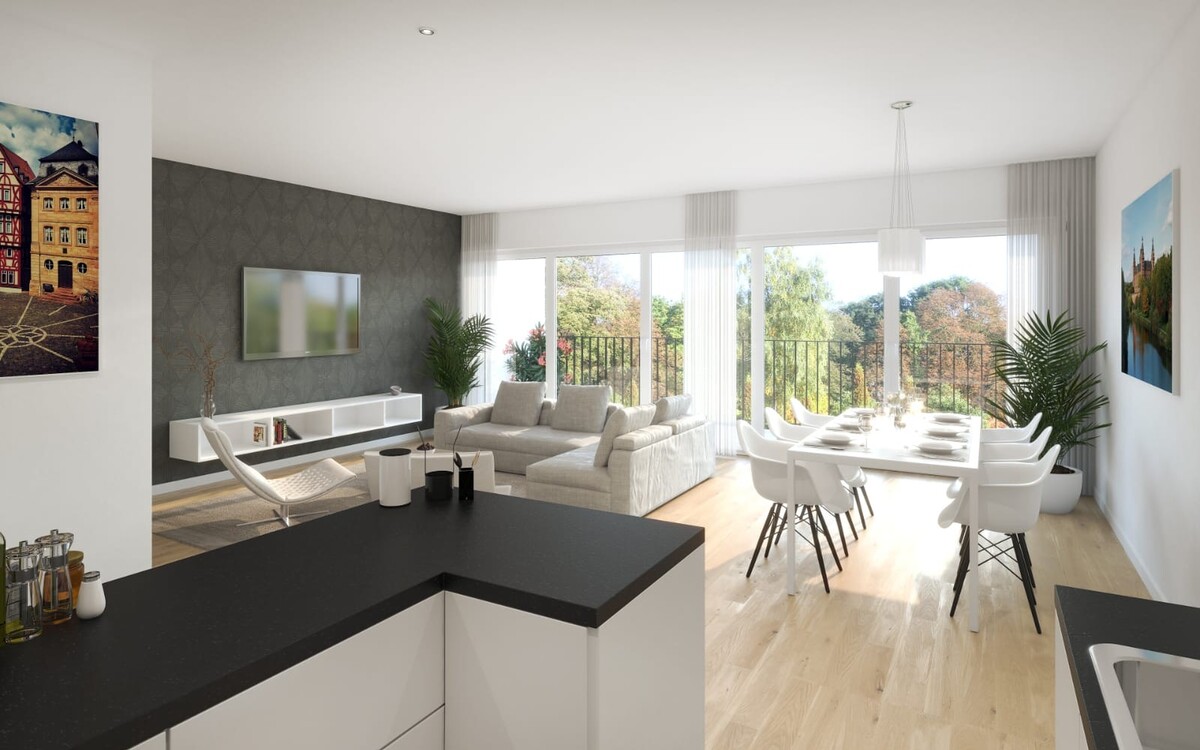 - Offener Wohn- und Essbereich: Helles Raumgefühl durch große Fensterflächen, direkter Zugang zu Balkon/Terrasse